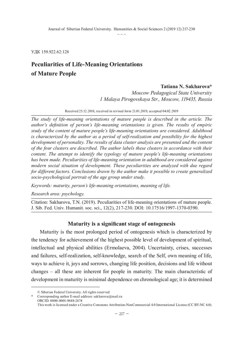 Библиографическое описание:Sakharova, Tatiana. Peculiarities of Life-Meaning Orientations of Mature People = Особенности смысложизненных ориентаций людей зрелого возраста / T. N. Sakharova. - Текст : непосредственный // Журнал Сибирского федерального университета. Гуманитарные науки. - 2019. - Т. 12, № 2. - С. 217-230. - Библиогр.: с. 228-230. - ISSN 1997-1370.