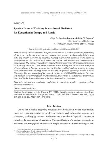 Библиографическое описание:Smolyaninova, Olga. Specific Issues of Training Intercultural Mediators for Education in Europe and Russia = Особенности подготовки поликультурных медиаторов для системы образования в Европе и России / O. G. Smolyaninova, Ju. V. Popova. - Текст : непосредственный // Журнал Сибирского федерального университета. Гуманитарные науки. - 2019. - Т. 12, № 2. - С. 247-260. - Библиогр.: с. 258-260. - ISSN 1997-1370.