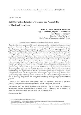 Библиографическое описание:Anti-Corruption Potential of Openness and Accessibility of Municipal Legal Acts = Антикоррупционный потенциал открытости и доступности муниципальных правовых актов / I. A. Damm [и др.]. - Текст : непосредственный // Журнал Сибирского федерального университета. Гуманитарные науки. - 2019. - Т. 12, № 3. - С. 378-392. - Библиогр.: с. 387-392. - ISSN 1997-1370.