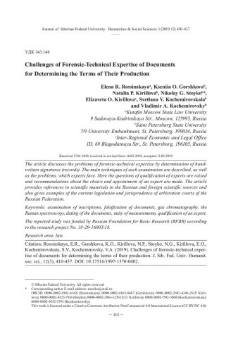 Библиографическое описание:Challenges of Forensic-Technical Expertise of Documents for Determining the Terms of Their Production = Задачи судебно-технической экспертизы документов для определения давности их изготовления / E. R. Rossinskaya [и др.]. - Текст : непосредственный // Журнал Сибирского федерального университета. Гуманитарные науки. - 2019. - Т. 12, № 3. - С. 410-437. - Библиогр.: с. 433-437. - ISSN 1997-1370.