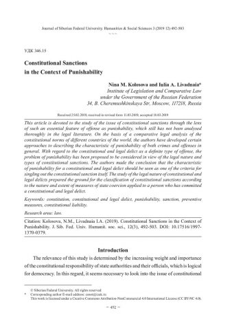 Библиографическое описание:Kolosova, Nina. Constitutional Sanctions in the Context of Punishability = Конституционные санкции в контексте признака наказуемости / N. M. Kolosova, I. A. Livadnaia. - Текст : непосредственный // Журнал Сибирского федерального университета. Гуманитарные науки. - 2019. - Т. 12, № 3. - С. 492-503. - Библиогр.: с. 502-503. - ISSN 1997-1370.