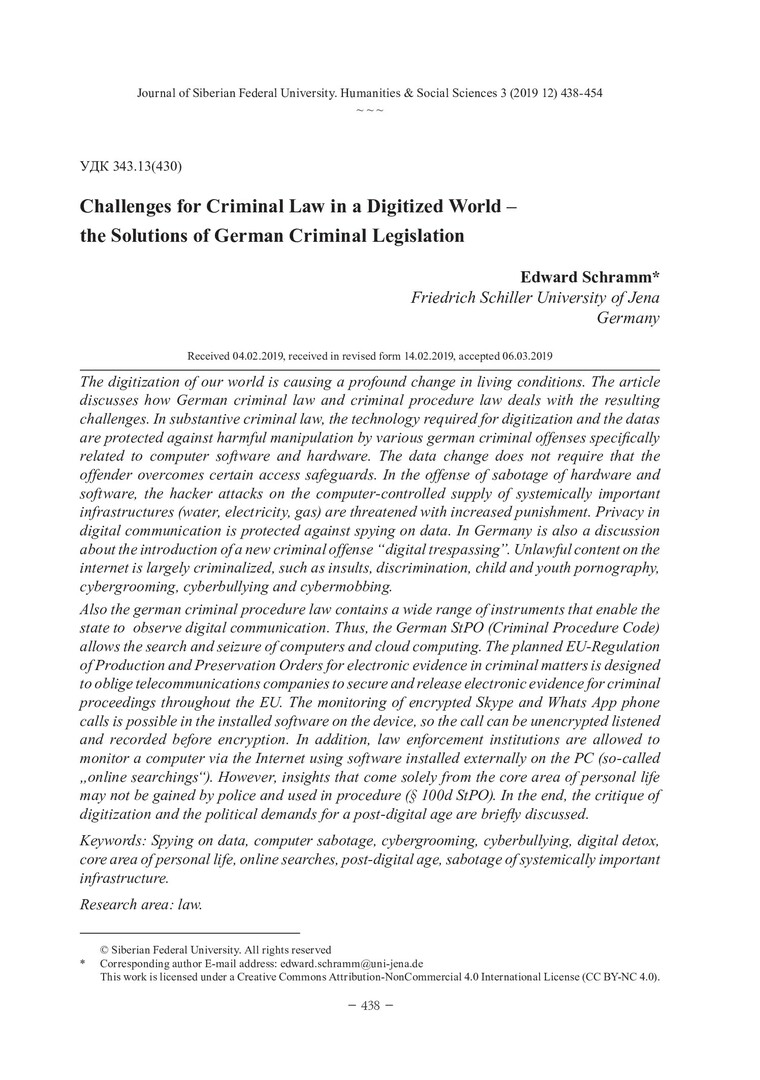 Библиографическое описание:Schramm, Edward. Challenges for Criminal Law in a Digitized World – the Solutions of German Criminal Legislation = Проблемы уголовного права в информационном мире и пути их решения в соответствии с немецким уголовным правом / Edward Schramm. - Текст : непосредственный // Журнал Сибирского федерального университета. Гуманитарные науки. - 2019. - Т. 12, № 3. - С. 438-454. - ISSN 1997-1370.