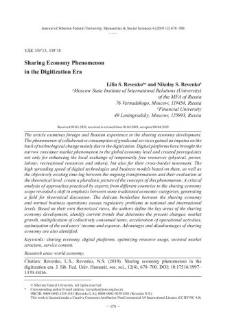 Библиографическое описание:Revenko, Lilia. Sharing Economy Phenomenon in the Digitization Era = Феномен экономики совместного потребления в эпоху цифровизации / L. S. Revenko , N. S. Revenko. - Текст : непосредственный // Журнал Сибирского федерального университета. Гуманитарные науки. - 2019. - Т. 12, № 4. - С. 678–700. - Библиогр.: с. 694-700. - ISSN 1997-1370.