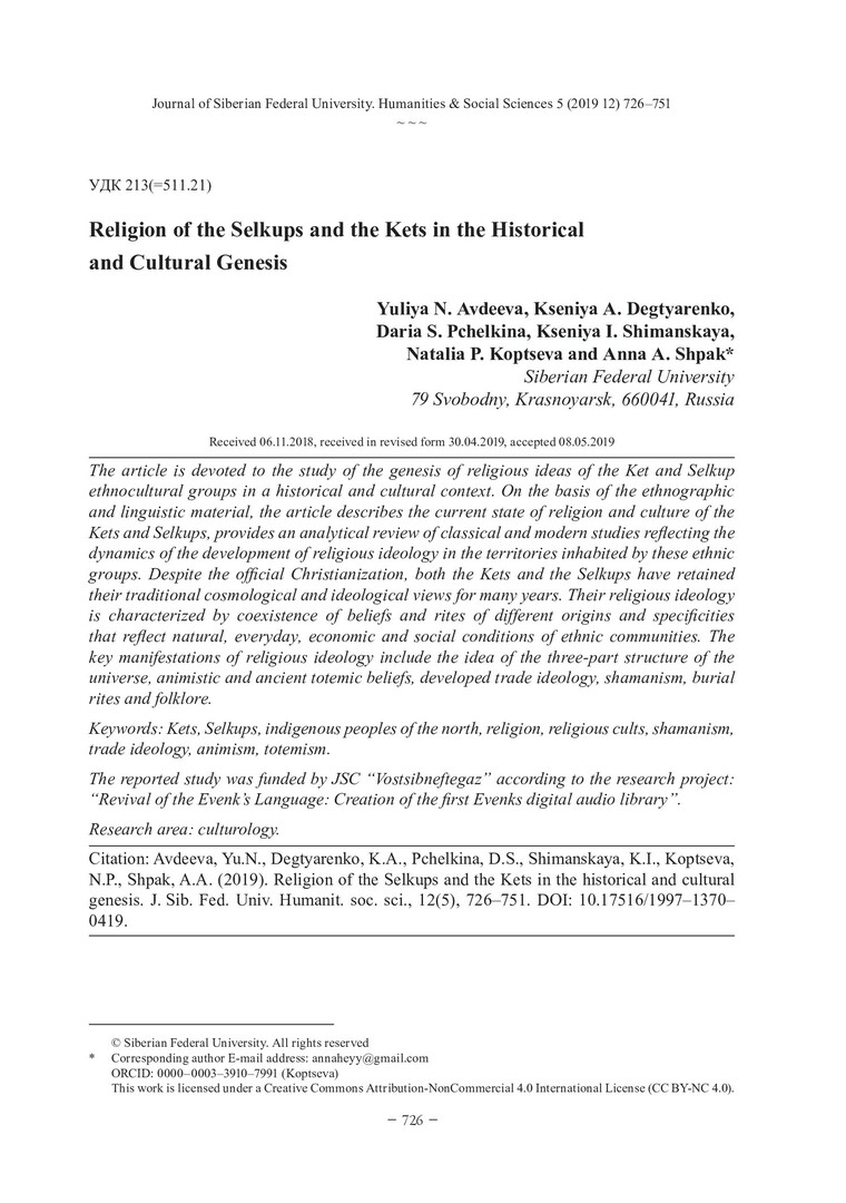 Библиографическое описание:Religion of the Selkups and the Kets in the Historical and Cultural Genesis = Религия селькупов и кетов в историческом и культурном генезисе / Yu. N. Avdeeva [и др.]. - Текст : непосредственный // Журнал Сибирского федерального университета. Гуманитарные науки. - 2019. - Т. 12, № 5. - С. 726–751. - Библиогр.: с. 743-751. - ISSN 1997-1370.