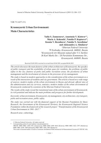 Библиографическое описание: Krasnoyarsk Urban Environment: Main Characteristics = Городская среда Красноярска: основные характеристики / Yu. S. Zamaraeva [и др.]. - Текст : непосредственный // Журнал Сибирского федерального университета. Гуманитарные науки. - 2019. - Т. 12, № 6. - С. 1106–1123. - Библиогр.: с. 1119-1123. - ISSN 1997-1370.