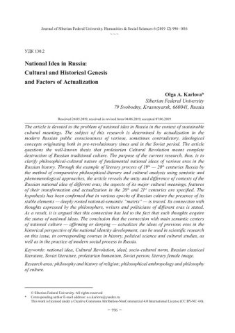 Библиографическое описание:Karlova, Olga. National Idea in Russia: Cultural and Historical Genesis and Factors of Actualization = Национальная идея в России: культурно-исторический генезис и факторы актуализации / O. A. Karlova. - Текст : непосредственный // Журнал Сибирского федерального университета. Гуманитарные науки. - 2019. - Т. 12, № 6. - С. 996–1016. - Библиогр.: с. 1013-1016. - ISSN 1997-1370.