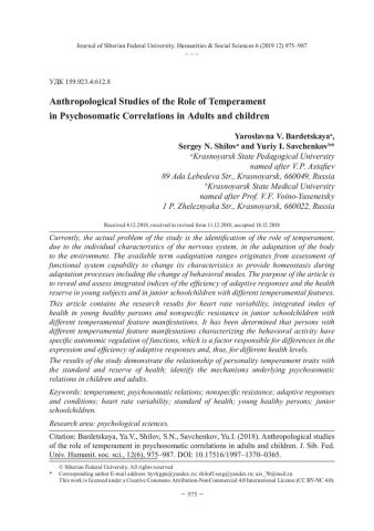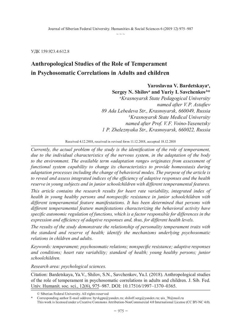 Библиографическое описание:Bardetskaya, Yaroslavna. Anthropological Studies of the Role of Temperament in Psychosomatic Correlations in Adults and Children = Антропологические исследования роли темперамента в психосоматических корреляциях у взрослых и детей / Ya. V. Bardetskaya, S. N. Shilov, Yu. I. Savchenkov. - Текст : непосредственный // Журнал Сибирского федерального университета. Гуманитарные науки. - 2019. - Т. 12, № 6. - С. 975–987. - Библиогр.: с. 984-987. - ISSN 1997-1370.