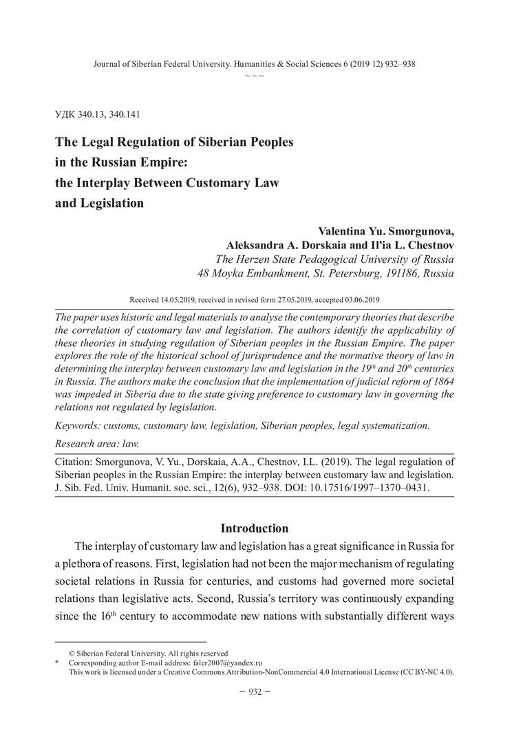 Библиографическое описание:Smorgunova, Valentina. The Legal Regulation of Siberian Peoples in the Russian Empire: the Interplay Between Customary Law and Legislation = Соотношение обычая и закона в регулировании жизнедеятельности народов Сибири в Российской империи / V. Yu. Smorgunova, A. A. Dorskaia, I. L. Chestnov. - Текст : непосредственный // Журнал Сибирского федерального университета. Гуманитарные науки. - 2019. - Т. 12, № 6. - С. 932–938. - Библиогр.: с. 936-938. - ISSN 1997-1370.