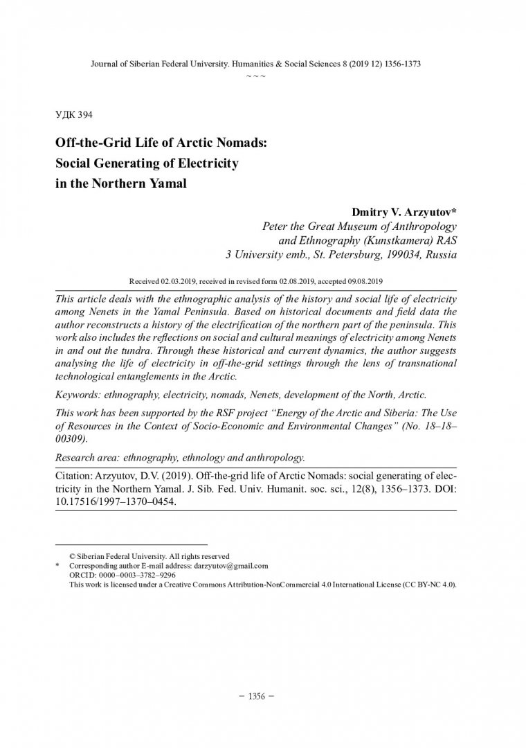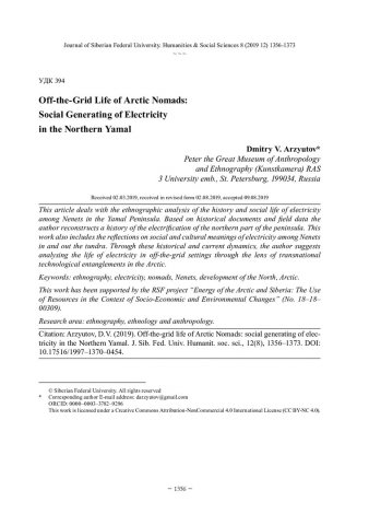Библиографическое описание:Arzyutov, Dmitry. Off-the-Grid Life of Arctic Nomads: Social Generating of Electricity in the Northern Yamal = Жизнь вне сети арктических кочевников: социальное генерирование электричества на Северном Ямале / D. V. Arzyutov. - Текст : непосредственный // Журнал Сибирского федерального университета. Гуманитарные науки. - 2019. - Т. 12, № 8. - С. 1356-1373. - Библиогр.: с. 1370-1373. - ISSN 1997-1370.