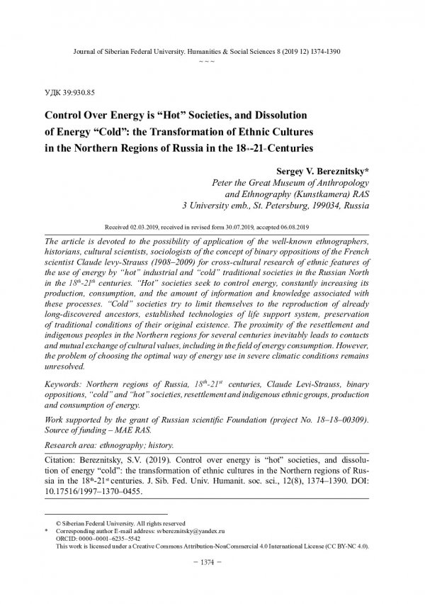Библиографическое описание:Bereznitsky, Sergey. Control Over Energy is "Hot" Societies, and Dissolution of Energy "Cold": the Transformation of Ethnic Cultures in the Northern Regions of Russia in the 18th-21st Centuries = Контроль над энергией "горячих" обществ и растворение в энергии "холодных": трансформация этнических культур в северных регионах России в XVIII–XXI веках / S. V. Bereznitsky. - Текст : непосредственный // Журнал Сибирского федерального университета. Гуманитарные науки. - 2019. - Т. 12, № 8. - С. 1374-1390. - Библиогр.: с. 1385-1390. - ISSN 1997-1370.
