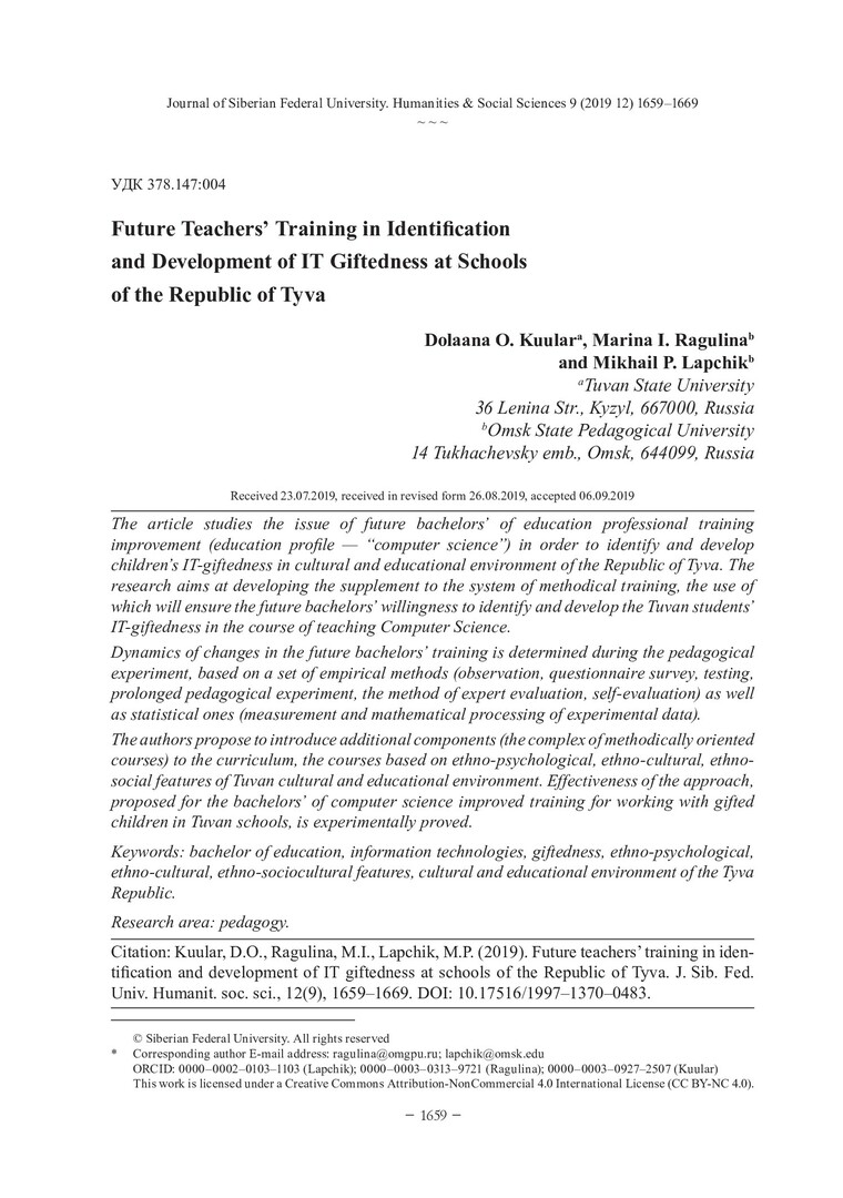 Библиографическое описание:Kuular, Dolaana. Future Teachers` Training in Identification and Development of IT Giftedness at Schools of the Republic of Tyva = Подготовка будущих учителей к выявлению и развитию одаренности в области информационных технологий в школах Республики Тыва / D. O. Kuular, M. I. Ragulina, M. P. Lapchik. - Текст : непосредственный // Журнал Сибирского федерального университета. Гуманитарные науки. - 2019. - Т. 12, № 9. - С. 1659-1669. - Библиогр.: с. 1667-1669. - ISSN 1997-1370.