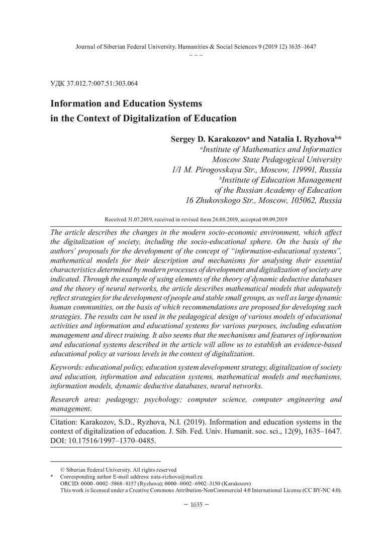 Библиографическое описание:Karakozov, Sergey. Information and Education Systems in the Context of Digitalization of Education = Информационно-образовательные системы в контексте цифровизации образования / S. D. Karakozov, N. I. Ryzhova. - Текст : непосредственный // Журнал Сибирского федерального университета. Гуманитарные науки. - 2019. - Т. 12, № 9. - С. 1635-1647. - Библиогр.: с. 1645-1647. - ISSN 1997-1370.