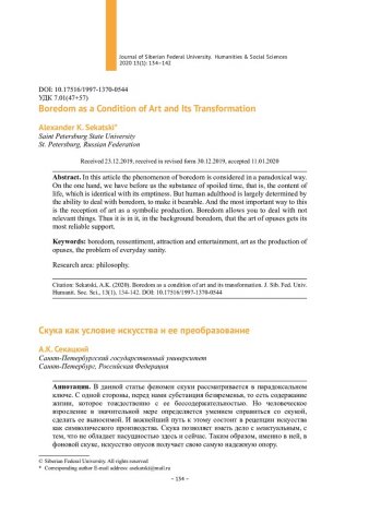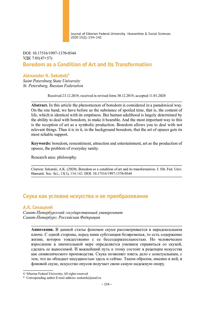 Библиографическое описание:Sekatski, Alexander. Boredom as a Condition of Art and Its Transformation = Скука как условие искусства и ее преобразование / A. K. Sekatski. - Текст : непосредственный // Журнал Сибирского федерального университета. Гуманитарные науки. - 2020. - Т. 13, № 1. - С. 134–142. - Библиогр.: с. - ISSN 1997-1370.