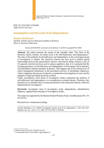 Библиографическое описание:Bochkarev, Sergei. Investigation and the Level of Its Independence = Следствие и уровень его самостоятельности / S. A. Bochkarev. - Текст : непосредственный // Журнал Сибирского федерального университета. Гуманитарные науки. - 2020. - Т. 13, № 1. - С. 27–41. - Библиогр.: с. 40-41. - ISSN 1997-1370.