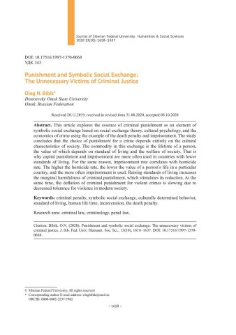 Библиографическое описание:Bibik, Oleg. Punishment and Symbolic Social Exchange: The Unnecessary Victims of Criminal Justice = Наказание и символический социальный обмен: ненужные жертвы уголовной юстиции / O. N. Bibik. - Текст : непосредственный // Журнал Сибирского федерального университета. Гуманитарные науки. - 2020. - Т. 13, № 10. - С. 1618–1637. - Библиогр.: с. 1632-1637. - ISSN 1997-1370.