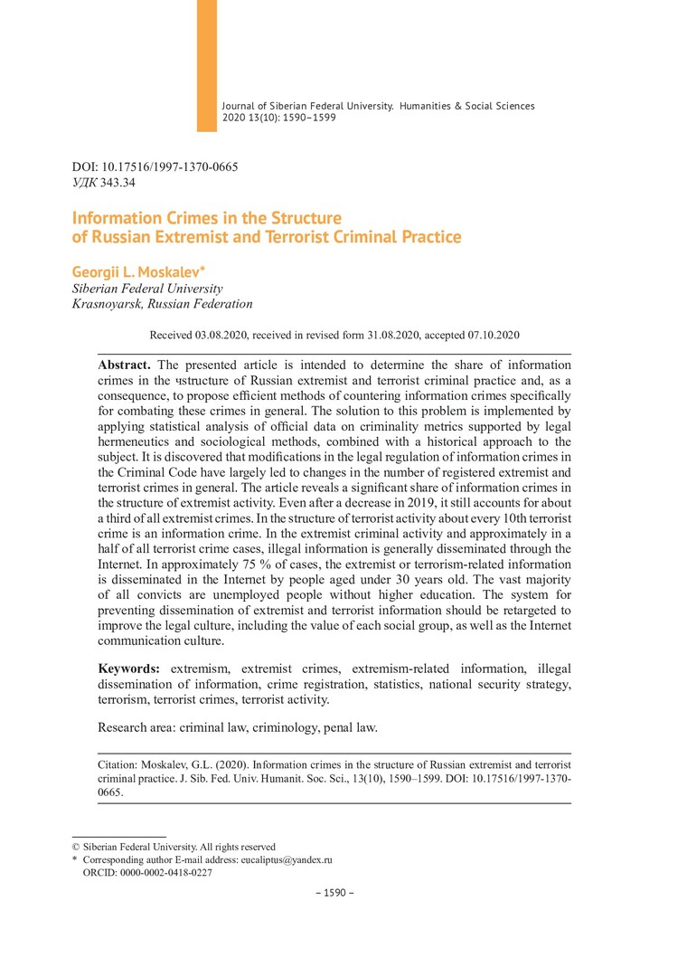 Библиографическое описание:Moskalev, Georgii. Information Crimes in the Structure of Russian Extremist and Terrorist Criminal Practice = Информационные преступления экстремистской и террористической направленности в структуре российской преступности / G. L. Moskalev. - Текст : непосредственный // Журнал Сибирского федерального университета. Гуманитарные науки. - 2020. - Т. 13, № 10. - С. 1590–1599. - Библиогр.: с. 1597-1599. - ISSN 1997-1370.