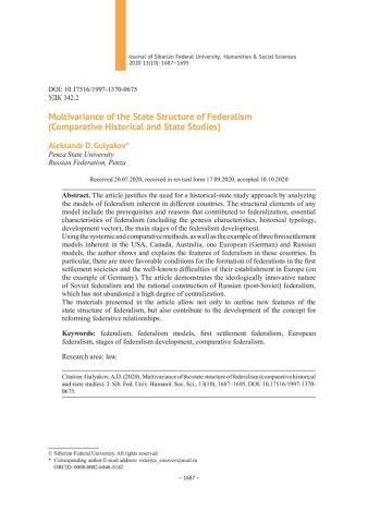 Библиографическое описание:Gulyakov, Aleksandr. Multivariance of the State Structure of Federalism (Comparative Historical and State Studies) = Многовариантность государственной конструкции федерализма (сравнительное историко-государствоведческое исследование) / A. D. Gulyakov. - Текст : непосредственный // Журнал Сибирского федерального университета. Гуманитарные науки. - 2020. - Т. 13, № 10. - С. 1687–1695. - Библиогр.: с. 1693-1695. - ISSN 1997-1370.