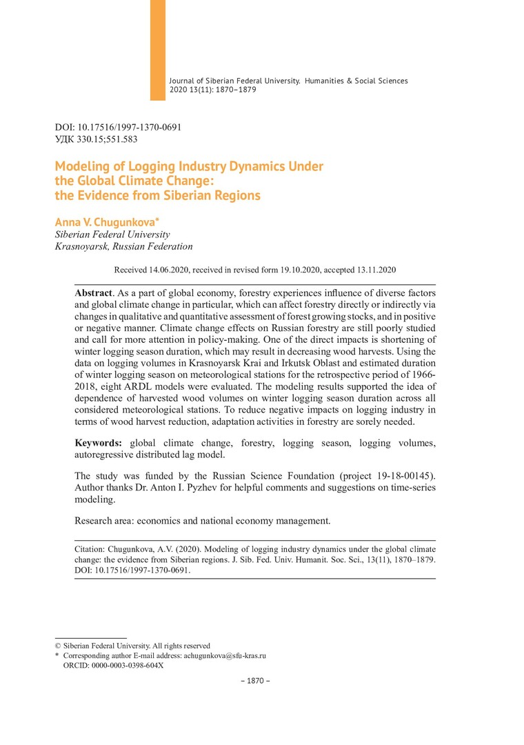 Библиографическое описание:Chugunkova, Anna. Modeling of Logging Industry Dynamics Under the Global Climate Change: the Evidence from Siberian Regions = Моделирование динамики развития лесозаготовительной промышленности под влиянием глобального изменения климата: пример регионов Сибири / A. V. Chugunkova. - Текст : непосредственный // Журнал Сибирского федерального университета. Гуманитарные науки. - 2020. - Т. 13, № 11. - С. 1870–1879. - Библиогр.: с. 1876-1879. - ISSN 1997-1370.