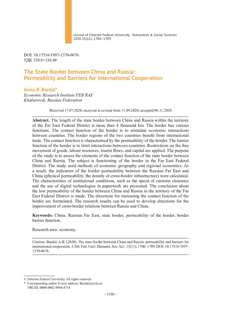 Библиографическое описание:Bardal, Anna. The State Border between China and Russia: Permeability and Barriers for International Cooperation = Российско-китайская граница: проницаемость и барьерность для международных взаимодействий / A. B. Bardal. - Текст : непосредственный // Журнал Сибирского федерального университета. Гуманитарные науки. - 2020. - Т. 13, № 11. - С. 1700–1709. - Библиогр.: с. 1707-1709. - ISSN 1997-1370.