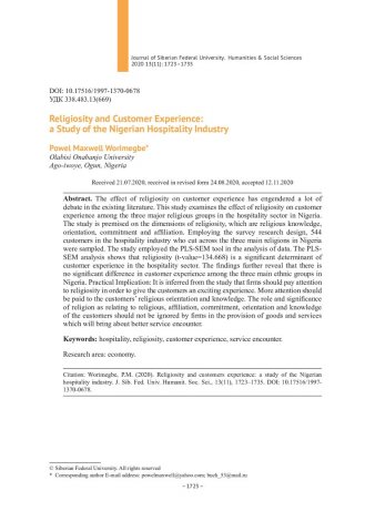 Библиографическое описание:Worimegbe, Powel. Religiosity and Customer Experience: a Study of the Nigerian Hospitality Industry = Религиозность и качество обслуживания клиентов: на примере сферы гостеприимства в Нигерии / P. M. Worimegbe. - Текст : непосредственный // Журнал Сибирского федерального университета. Гуманитарные науки. - 2020. - Т. 13, № 11. - С. 1723–1735. - Библиогр.: с. 1733-1735. - ISSN 1997-1370.