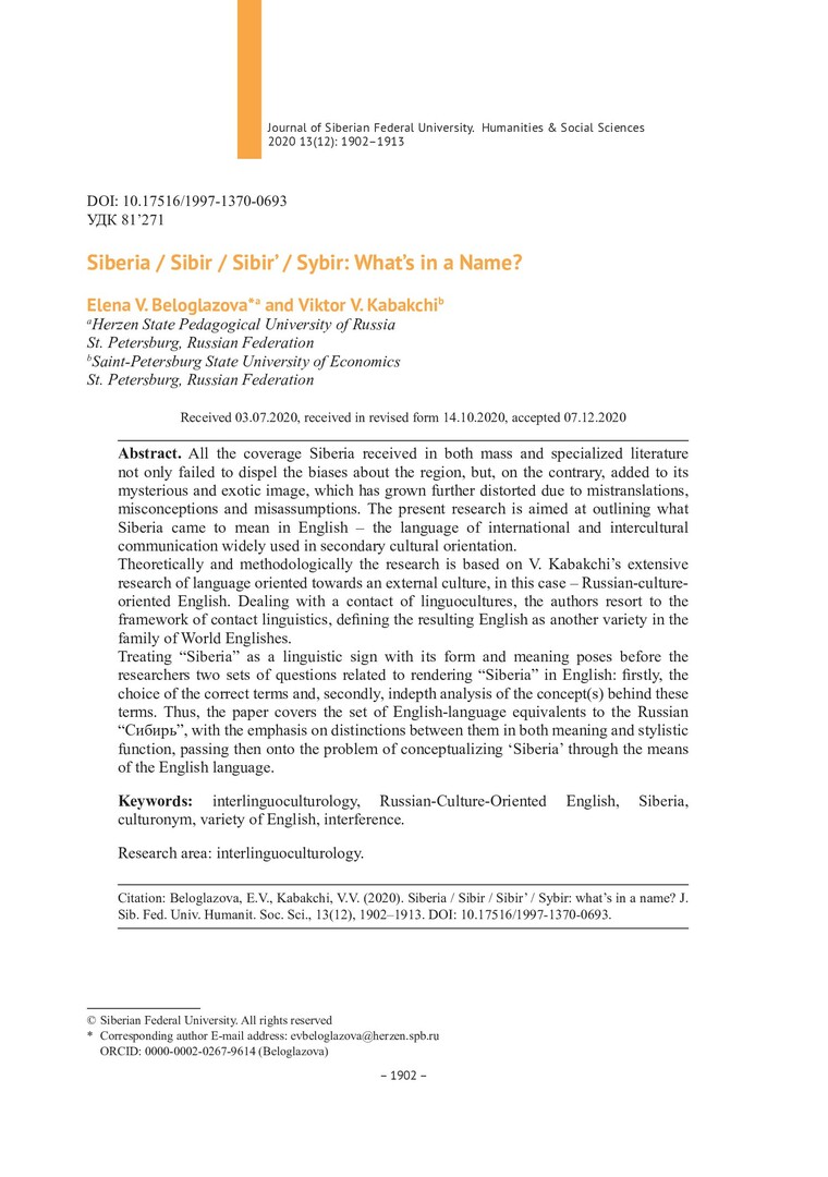 Библиографическое описание:Beloglazova, Elena. Siberia / Sibir / Sibir` / Sybir: What`s in a Name? = Siberia / Sibir / Sibir` / Sybir: что значит имя? / E. V. Beloglazova, V. V. Kabakchi. - Текст : непосредственный // Журнал Сибирского федерального университета. Гуманитарные науки. - 2020. - Т. 13, № 12. - С. 1902-1913. - Библиогр.: с. 1911-1913. - ISSN 1997-1370.