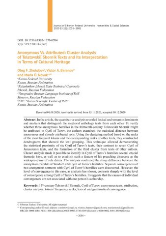 Библиографическое описание:Zholobov, Oleg. Anonymous Vs. Attributed: Cluster Analysis of Tolstovskii Sbornik Texts and Its Interpretation in Terms of Cultural Heritage = Анонимность vs. атрибутированность: кластерный анализ текстов Толстовского сборника и его интерпретация в аспекте культурного наследия / O. F. Zholobov, V. A. Baranov, M. O. Novak. - Текст : непосредственный // Журнал Сибирского федерального университета. Гуманитарные науки. - 2020. - Т. 13, № 12. - С. 2056-2081. - Библиогр.: с. 2077-2081. - ISSN 1997-1370.