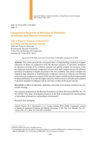 Библиографическое описание:Popova, Julia. Comparative Research of Attitudes to Mediation at Galician and Siberian Universities = Сравнительные исследования отношения к медиации в университетах Галиции и Сибири / Ju. V. Popova. - Текст : непосредственный // Журнал Сибирского федерального университета. Гуманитарные науки. - 2020. - Т. 13, № 12. - С. 1962-1972. - Библиогр.: с. 1971-1972. - ISSN 1997-1370.