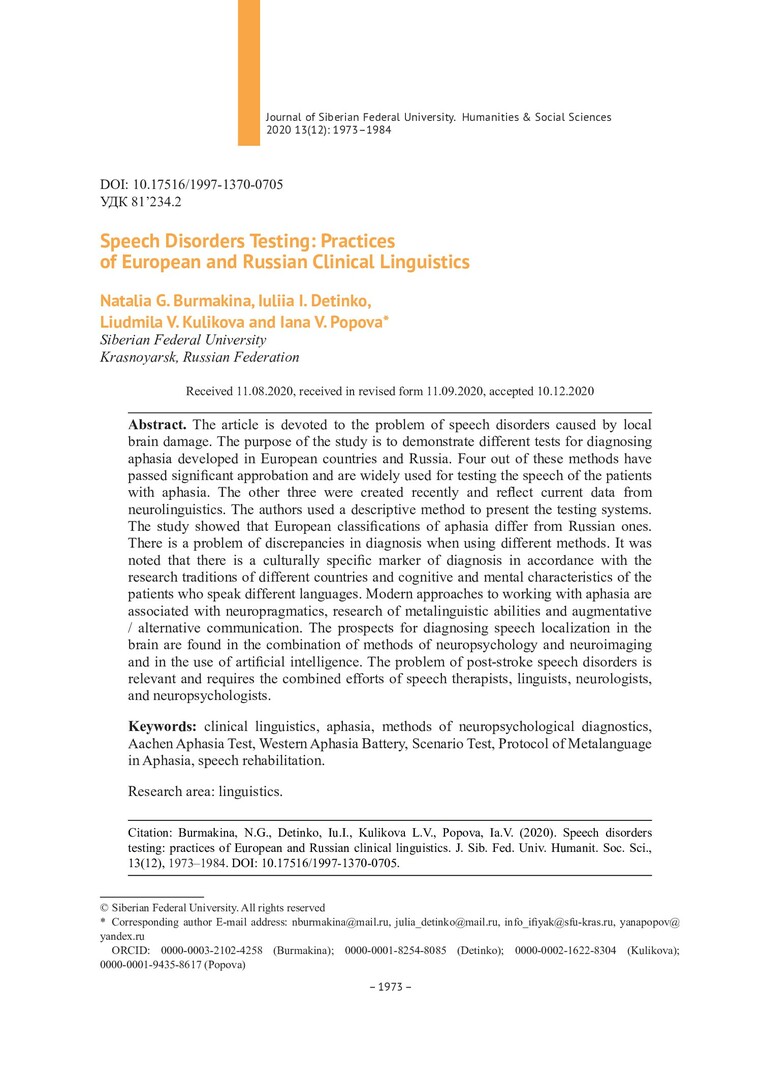 Библиографическое описание:Speech disorders testing: practices of European and Russian clinical linguistics = Тестирование когнитивных речевых расстройств: опыт европейской и российской клинической лингвистики / N. G. Burmakina, Iu. I. Detinko, L. V. Kulikova, Ia. V. Popova. - Текст : непосредственный // Журнал Сибирского федерального университета. Гуманитарные науки. - 2020. - Т. 13, № 12. - С. 1973-1984. - Библиогр.: с. 1982-1984. - ISSN 1997-1370.