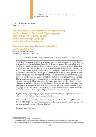 Библиографическое описание:Magirovskaya, Oksana. Specific Features and Patterns of Conceptualizing the Emotions and Feelings in Sign Language (the Case of the Regional Variant of the Russian Sign Language in the Republic of Khakassia) = Специфика и способы концептуализации эмоций и чувств в жестовом языке (на материале регионального варианта русского жестового языка Республики Хакасия) / O. V. Magirovskaya, E. S. Privalikhina, V. S. Srmikian. - Текст : непосредственный // Журнал Сибирского федерального университета. Гуманитарные науки. - 2020. - Т. 13, № 12. - С. 1927-1936. - Библиогр.: с. 1935-1936. - ISSN 1997-1370.