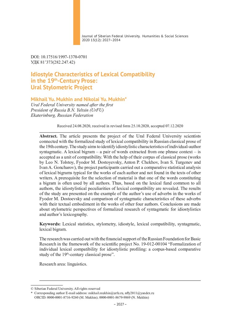 Библиографическое описание:Mukhin, Mikhail. Idiostyle Characteristics of Lexical Compatibility in the 19th-Сentury Prose: Ural Stylometric Project = Идиостилевые характеристики лексической сочетаемости в прозе XIX в.: уральский стилометрический проект / M. Yu. Mukhin, Nikolai Yu. Mukhin. - Текст : непосредственный // Журнал Сибирского федерального университета. Гуманитарные науки. - 2020. - Т. 13, № 12. - С. 2027-2034. - Библиогр.: с. 2033-2034. - ISSN 1997-1370.