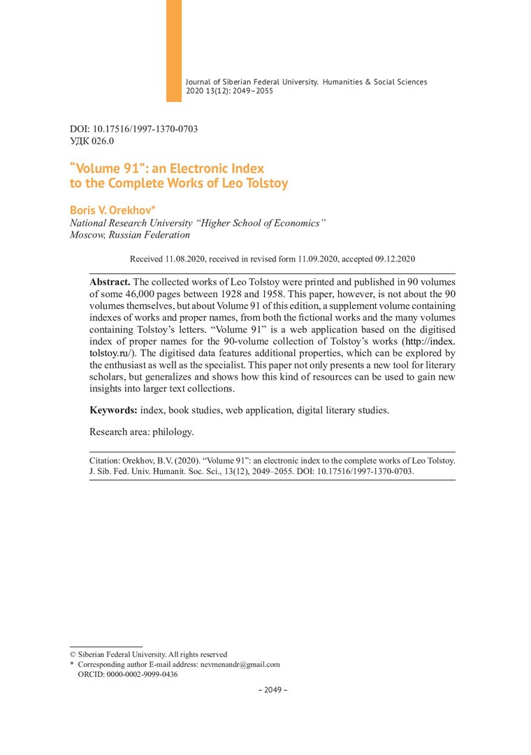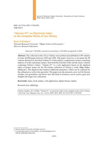 Библиографическое описание:Orekhov, Boris. "Volume 91": an Electronic Index to the Complete Works of Leo Tolstoy = "91-й том": возможности электронного указателя / B. V. Orekhov. - Текст : непосредственный // Журнал Сибирского федерального университета. Гуманитарные науки. - 2020. - Т. 13, № 12. - С. 2049-2055. - Библиогр.: с. 2054-2055. - ISSN 1997-1370.