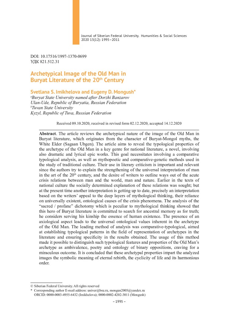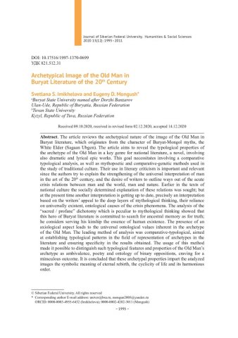 Библиографическое описание:Imikhelova, Svetlana. Archetypical Image of the Old Man in Buryat Literature of the 20th Century = Образ-архетип старика в бурятской литературе XX века / S. S. Imikhelova, E. D. Mongush. - Текст : непосредственный // Журнал Сибирского федерального университета. Гуманитарные науки. - 2020. - Т. 13, № 12. - С. 1995-2011. - Библиогр.: с. 2008-2011. - ISSN 1997-1370.