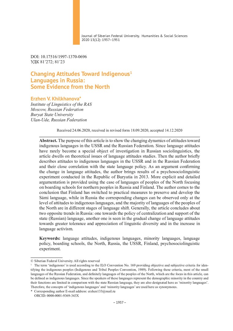 Библиографическое описание:Khilkhanova, Erzhen. Changing Attitudes Toward Indigenous1 Languages in Russia: Some Evidence from the North = Смена установок по отношению к языкам коренных народов в России (на примере языков народов Севера) / E. V. Khilkhanova. - Текст : непосредственный // Журнал Сибирского федерального университета. Гуманитарные науки. - 2020. - Т. 13, № 12. - С. 1937-1951. - Библиогр.: с. 1947-1951. - ISSN 1997-1370.