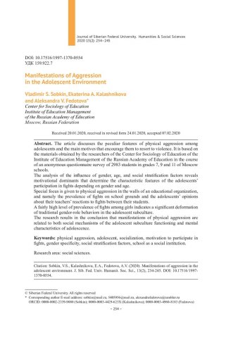 Библиографическое описание:Sobkin, Vladimir. Manifestations of Aggression in the Adolescent Environment = Проявления агрессии в подростковой среде / V. S. Sobkin, E. A. Kalashnikova, A. V. Fedotova. - Текст : непосредственный // Журнал Сибирского федерального университета. Гуманитарные науки. - 2020. - Т. 13, № 2. - С. 234–245. - Библиогр.: с. 243-245. - ISSN 1997-1370.