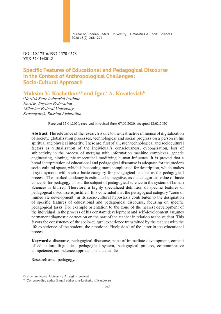 Библиографическое описание:Kochetkov, Maksim. Specific Features of Educational and Pedagogical Discourse in the Context of Anthropological Challenges: Socio-Cultural Approach = Специфические особенности педагогического дискурса в условиях антропологических вызовов : социокультурный подход / M. V. Kochetkov, I. A. Kovalevich. - Текст : непосредственный // Журнал Сибирского федерального университета. Гуманитарные науки. - 2020. - Т. 13, № 2. - С. 268–277. - Библиогр.: с. 275-277. - ISSN 1997-1370.