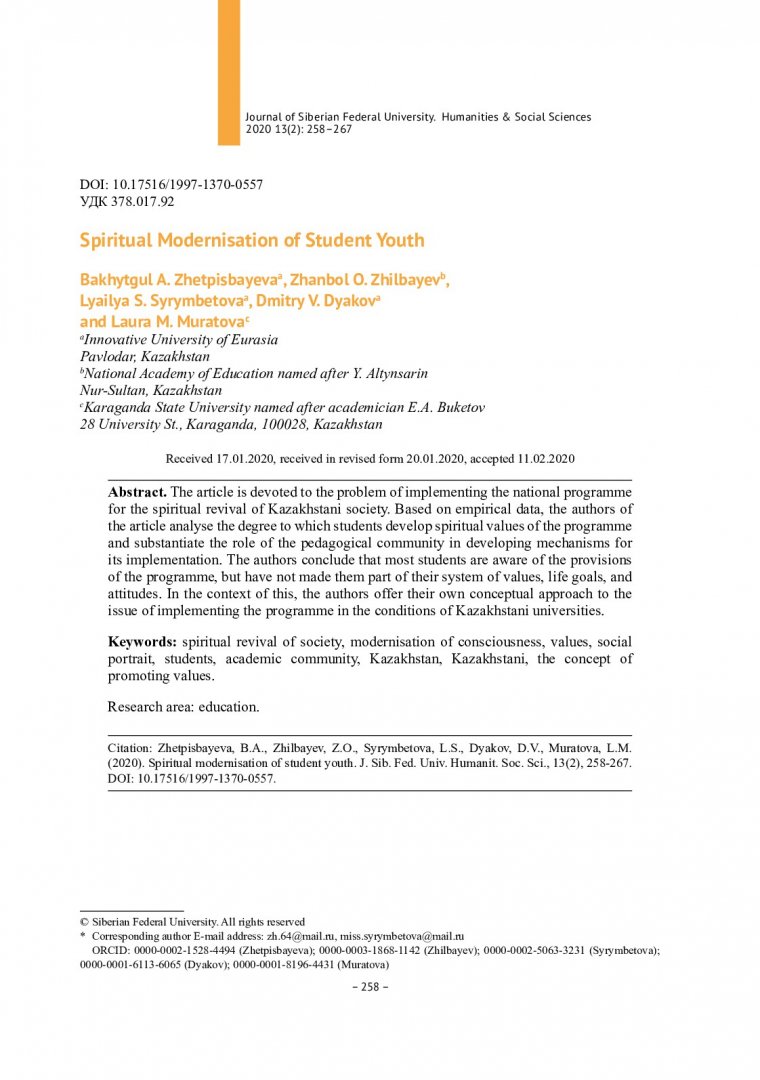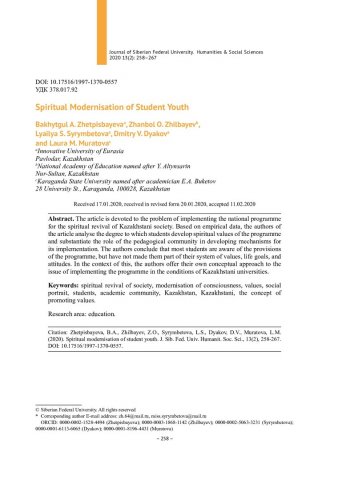 Библиографическое описание: Spiritual Modernisation of Student Youth = К вопросу о духовной модернизации студенческой молодежи / B. A. Zhetpisbayeva, Zh. O. Zhilbayev, L. S. Syrymbetova [и др.]. - Текст : непосредственный // Журнал Сибирского федерального университета. Гуманитарные науки. - 2020. - Т. 13, № 2. - С. 258–267. - Библиогр.: с. 266-267. - ISSN 1997-1370.