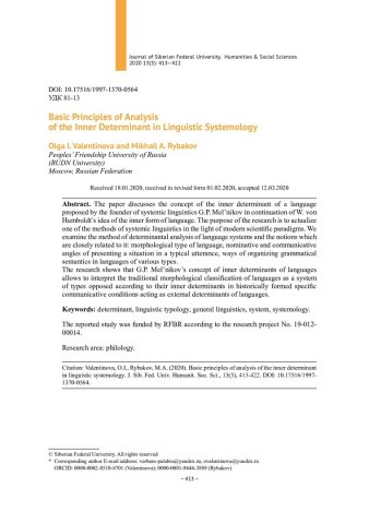 Библиографическое описание:Valentinova, Olga. Basic Principles of Analysis of the Inner Determinant in Linguistic Systemology = Основные принципы анализа внутренней детерминанты в лингвистической системологии / O. I. Valentinova, M. A. Rybakov. - Текст : непосредственный // Журнал Сибирского федерального университета. Гуманитарные науки. - 2020. - Т. 13, № 3. - С. 413–422. - Библиогр.: с. 421-422. - ISSN 1997-1370.