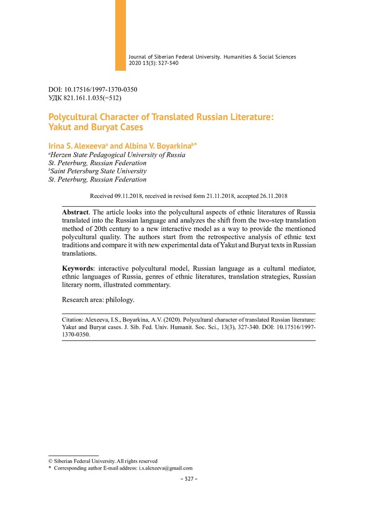 Библиографическое описание:Alexeeva, Irina. Polycultural Character of Translated Russian Literature: Yakut and Buryat Cases = Поликультурность переводной русской литературы : якутский и бурятский опыт / I. S. Alexeeva, A. V. Boyarkina. - Текст : непосредственный // Журнал Сибирского федерального университета. Гуманитарные науки. - 2020. - Т. 13, № 3. - С. 327-340. - Библиогр.: с. 337-340. - ISSN 1997-1370.