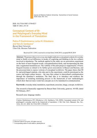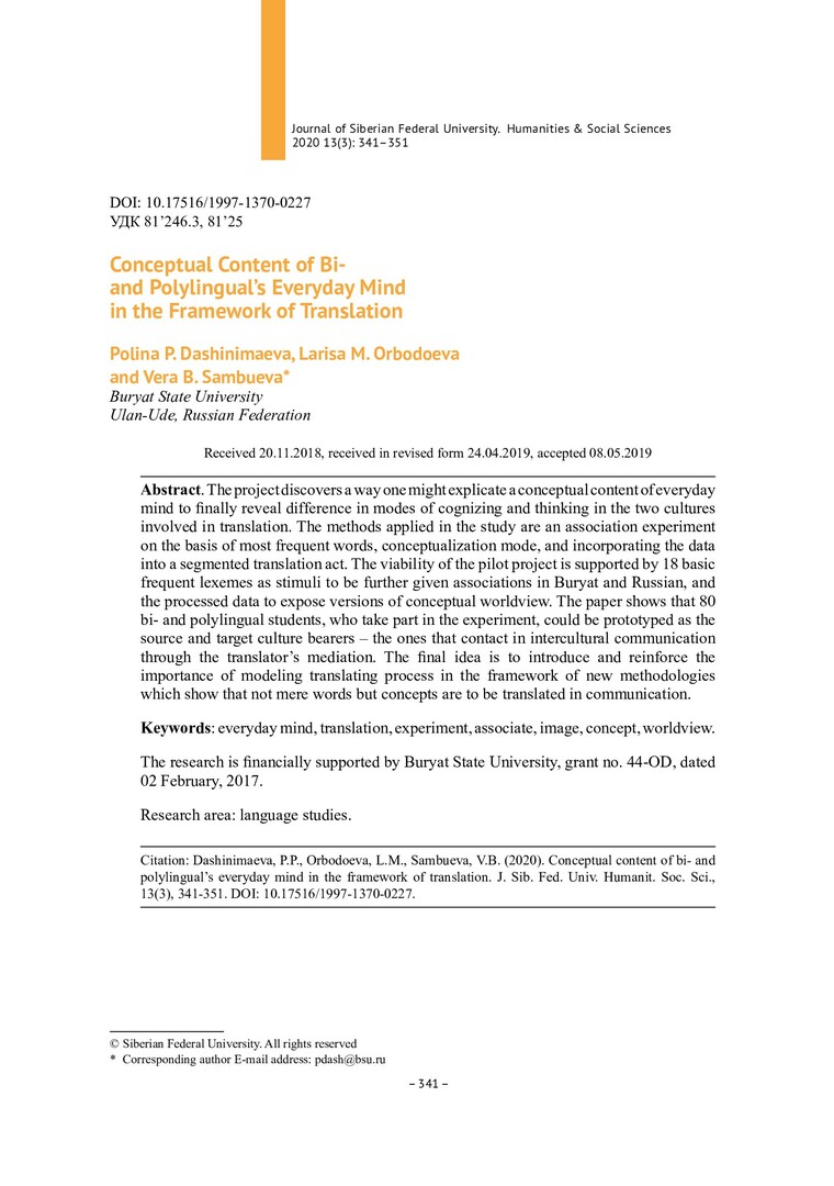 Библиографическое описание:Dashinimaeva, Polina. Conceptual Content of Bi- and Polylingual`s Everyday Mind in the Framework of Translation = Концептуальное содержание обыденного сознания би- и полилингва в ракурсе перевода / P. P. Dashinimaeva, L. M. Orbodoeva, V. B. Sambueva. - Текст : непосредственный // Журнал Сибирского федерального университета. Гуманитарные науки. - 2020. - Т. 13, № 3. - С. 341–351. - Библиогр.: с. 350-351. - ISSN 1997-1370.