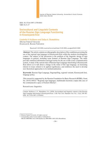 Библиографическое описание: Kulikova, Liudmila. Sociocultural and Linguistic Contexts of the Russian Sign Language Functioning in Krasnoyarsk Krai = Социокультурный и лингвистический контексты функционирования русского жестового языка в Красноярском крае / L. V. Kulikova, S. A. Shatokhina. - Текст : непосредственный // Журнал Сибирского федерального университета. Гуманитарные науки. - 2020. - Т. 13, № 3. - С. 296-303. - Библиогр.: с. 301-303. - ISSN 1997-1370.