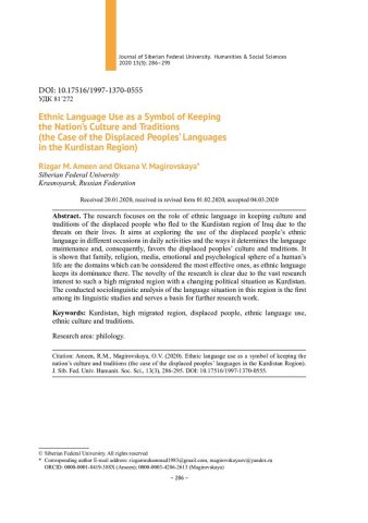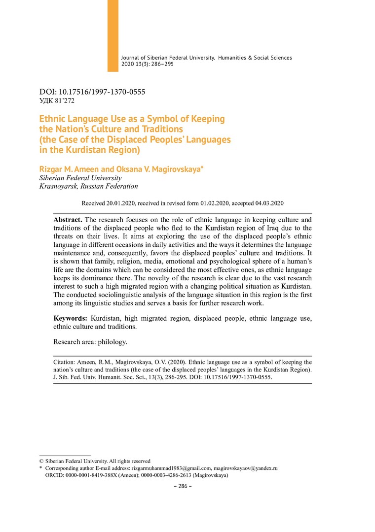 Библиографическое описание: Ameen, Rizgar. Ethnic Language Use as a Symbol of Keeping the Nation`s Culture and Traditions (the Case of the Displaced Peoples` Languages in the Kurdistan Region) = Этнический язык как символ сохранения культуры и традиций (на примере языковой ситуации вынужденных переселенцев на территории Курдистана) / R. M. Ameen, O. V. Magirovskaya. - Текст : непосредственный // Журнал Сибирского федерального университета. Гуманитарные науки. - 2020. - Т. 13, № 3. - С. 286–295. - Библиогр.: с. 293-295. - ISSN 1997-1370.