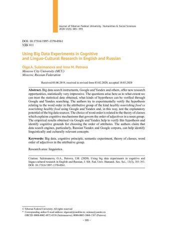 Библиографическое описание:Suleimanova, Olga. Using Big Data Experiments in Cognitive and Linguo-Cultural Research in English and Russian = Использование больших данных в когнитивных и лингвокультурологических исследованиях английского и русского языков / O. A. Suleimanova, I. M. Petrova. - Текст : непосредственный // Журнал Сибирского федерального университета. Гуманитарные науки. - 2020. - Т. 13, № 3. - С. 385–393. - Библиогр.: с. 391-393. - ISSN 1997-1370.