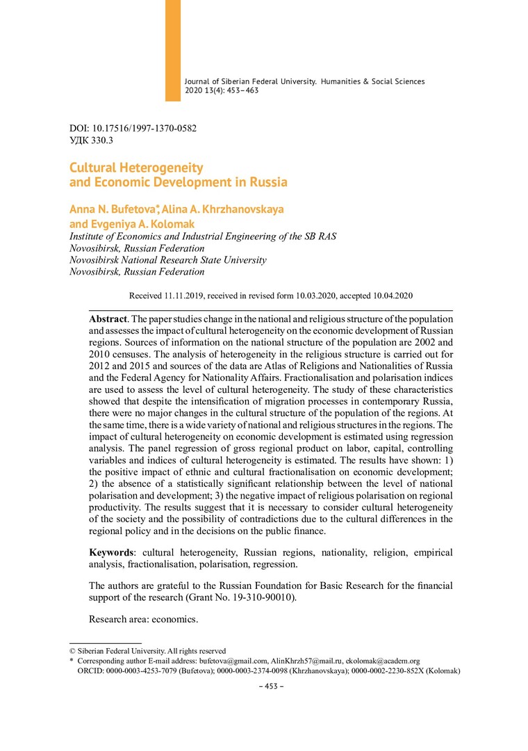 Библиографическое описание:Bufetova, Anna. Cultural Heterogeneity and Economic Development in Russia = Культурная неоднородность и экономическое развитие в России / A. N. Bufetova, A. A. Khrzhanovskaya, E. A. Kolomak. - Текст : непосредственный // Журнал Сибирского федерального университета. Гуманитарные науки. - 2020. - Т. 13, № 4. - С. 453–463. - Библиогр.: с. 461-463. - ISSN 1997-1370.