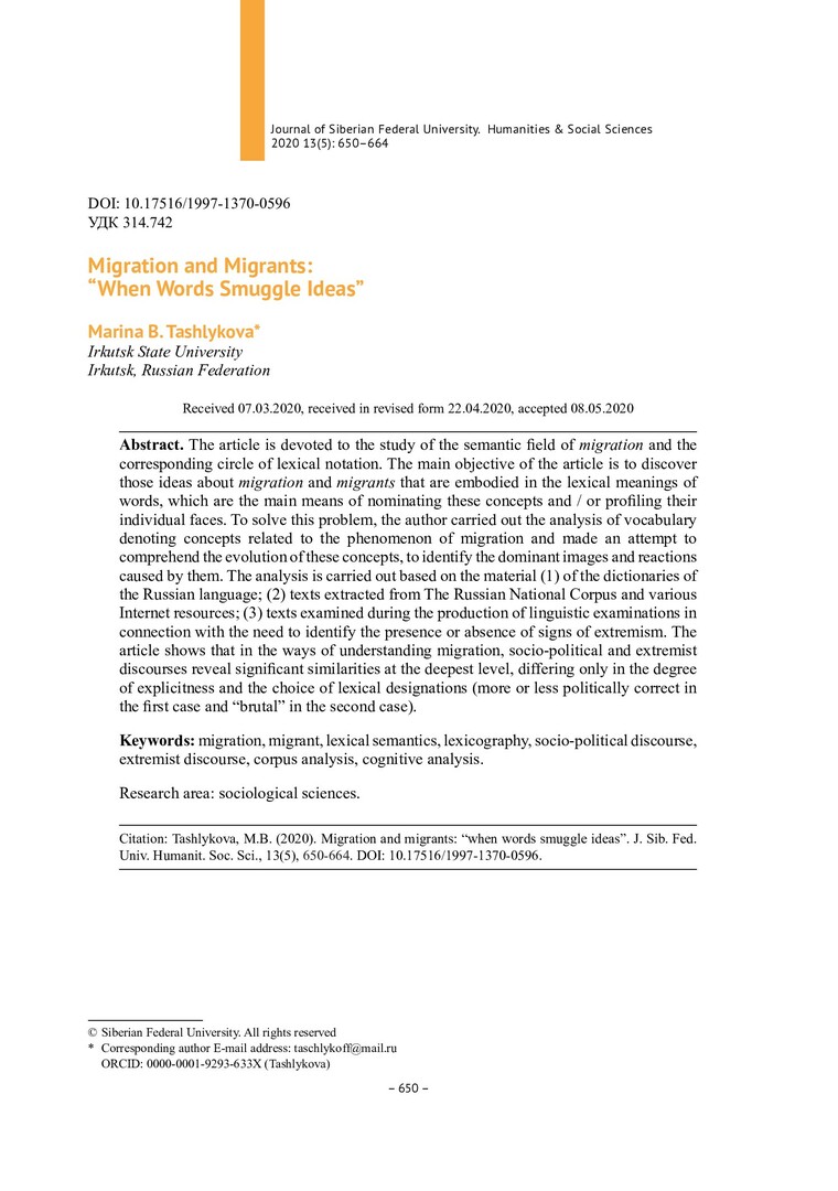 Библиографическое описание:Tashlykova, Marina. Migration and Migrants: "When Words Smuggle Ideas" = Mиграция и мигранты : "когда слова провозят мысль контрабандой" / M. B. Tashlykova. - Текст : непосредственный // Журнал Сибирского федерального университета. Гуманитарные науки. - 2020. - Т. 13, № 5. - С. 650–664. - Библиогр.: с. 663-664. - ISSN 1997-1370.