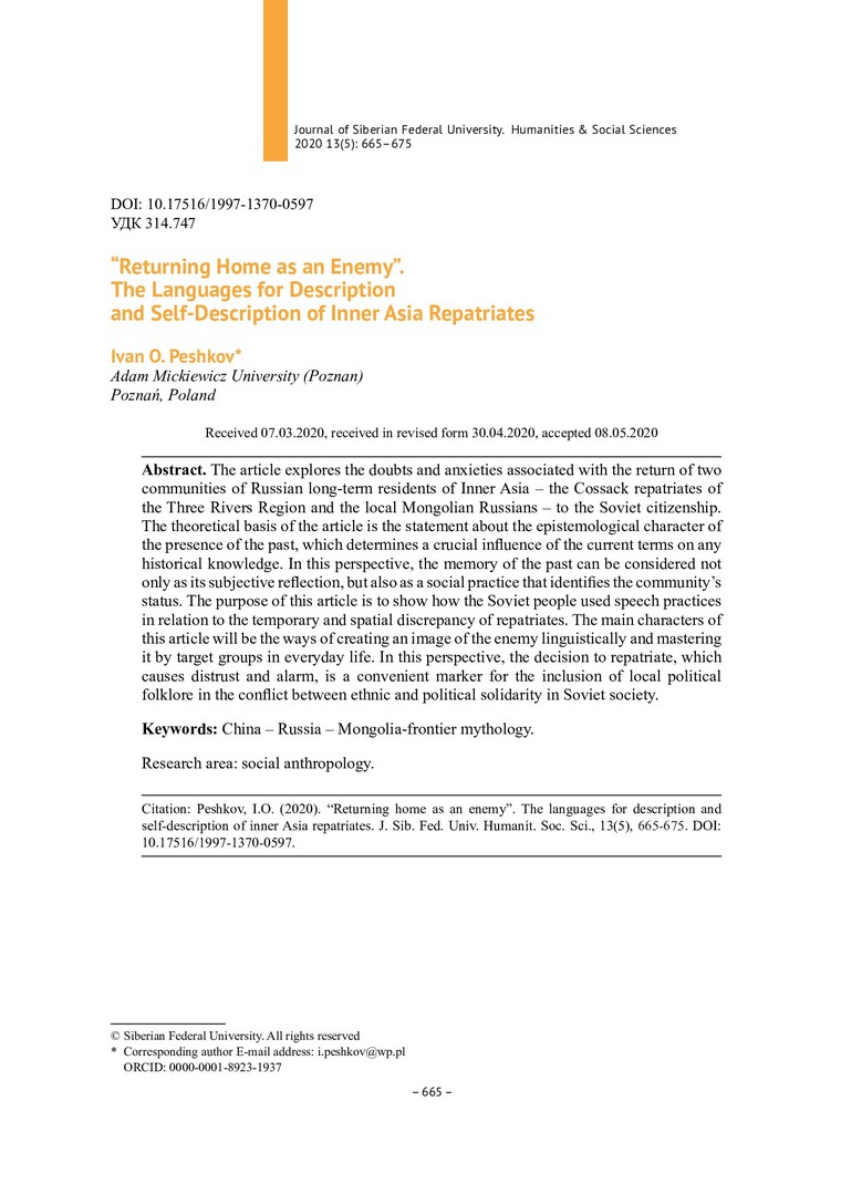 Библиографическое описание:Peshkov, Ivan. "Returning Home as an Enemy". The Languages for Description and Self-Description of Inner Asia Repatriates = Вернуться на Родину врагом. Языки описания и самоописания репатриантов из Внутренней Азии / I. O. Peshkov. - Текст : непосредственный // Журнал Сибирского федерального университета. Гуманитарные науки. - 2020. - Т. 13, № 5. - С. 665–675. - Библиогр.: с. 673-675. - ISSN 1997-1370.