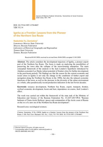 Библиографическое описание:Zamiatina, Nadezhda. Igarka as a Frontier: Lessons from the Pioneer of the Northern Sea Route = Игарка как фронтир : уроки "пионера" Севморпути / N. Yu. Zamiatina. - Текст : непосредственный // Журнал Сибирского федерального университета. Гуманитарные науки. - 2020. - Т. 13, № 5. - С. 783–799. - Библиогр.: с. 797-799. - ISSN 1997-1370.