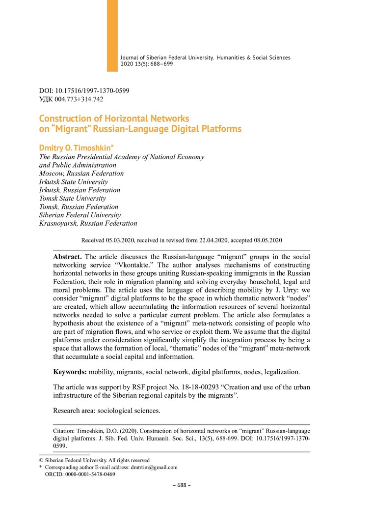 Библиографическое описание:Timoshkin, Dmitry. Construction of Horizontal Networks on "Migrant" Russian-Language Digital Platforms = Конструирование горизонтальных сетей на "мигрантских" русскоязычных цифровых площадках / D. O. Timoshkin. - Текст : непосредственный // Журнал Сибирского федерального университета. Гуманитарные науки. - 2020. - Т. 13, № 5. - С. 688–701. - Библиогр.: с. 697-701. - ISSN 1997-1370.