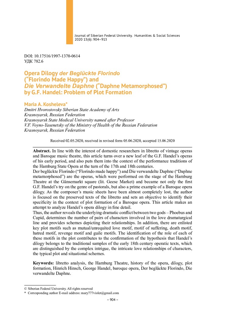 Библиографическое описание:Kosheleva, Maria. Opera Dilogy der Begluckte Florindo ("Florindo Made Happy") and Die Verwandelte Daphne ("Daphne Metamorphosed") by G.F. Handel: Problem of Plot Formation = Оперная дилогия "Счастливый Флориндо" и "Преображенная Дафна" Г. Ф. Генделя : к вопросу о сюжетосложении / M. A. Kosheleva. - Текст : непосредственный // Журнал Сибирского федерального университета. Гуманитарные науки. - 2020. - Т. 13, № 6. - С. 904–913. - Библиогр.: с. 911-913. - ISSN 1997-1370.