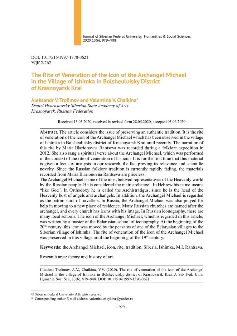 Библиографическое описание:Trofimov, Aleksandr. The Rite of Veneration of the Icon of the Archangel Michael in the Village of Ishimka in Bolsheuluisky District of Krasnoyarsk Krai = Обряд почитания иконы Архангела Михаила в деревне Ишимке Большеулуйского района Красноярского края / A. V. Trofimov, V. V. Chaikina. - Текст : непосредственный // Журнал Сибирского федерального университета. Гуманитарные науки. - 2020. - Т. 13, № 6. - С. 979–988. - Библиогр.: с. 987-988. - ISSN 1997-1370.