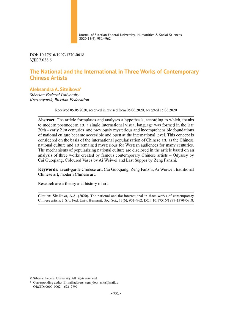 Библиографическое описание:Sitnikova, Aleksandra. The National and the International in Three Works of Contemporary Chinese Artists = Национальное и интернациональное в трех произведениях современных китайских художников / A. A. Sitnikova. - Текст : непосредственный // Журнал Сибирского федерального университета. Гуманитарные науки. - 2020. - Т. 13, № 6. - С. 951–962. - Библиогр.: с. 960-962. - ISSN 1997-1370.